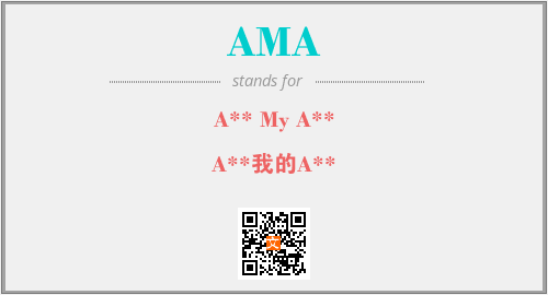 英文缩略词“AMA”经常作为“A** My A**”的英文缩写来使用,中文表示:“A**我的A**”。本文将详细介绍英文缩写词AMA所代表英文单词,其对应的中文拼音、详细解释以及在英语中的流行度。此外,还有关于缩略词AMA的分类、应用领域及相关应用示例等。