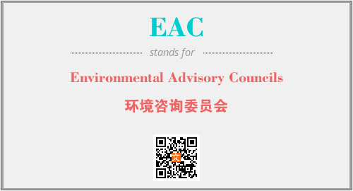 上述内容是“Environmental Advisory Councils”作为“EAC”的缩写,解释为“环境咨询委员会”时的信息,以及英文缩略词EAC所代表的英文单词,其对应的中文拼音、详细解释以及在英文中的流行度和相关分类、应用领域及应用示例等。