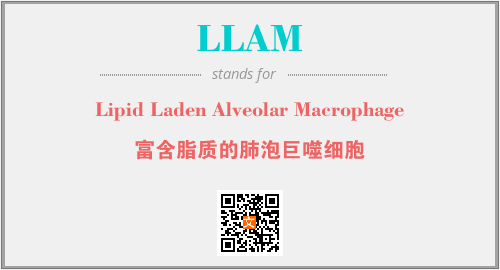 上述内容是“Lipid Laden Alveolar Macrophage”作为“LLAM”的缩写,解释为“富含脂质的肺泡巨噬细胞”时的信息,以及英文缩略词LLAM所代表的英文单词,其对应的中文拼音、详细解释以及在英文中的流行度和相关分类、应用领域及应用示例等。