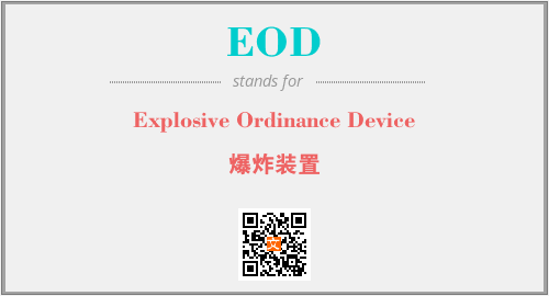 英文缩略词“EOD”经常作为“Explosive Ordinance Device”的英文缩写来使用,中文表示:“爆炸装置”。本文将详细介绍英文缩写词EOD所代表英文单词,其对应的中文拼音、详细解释以及在英语中的流行度。此外,还有关于缩略词EOD的分类、应用领域及相关应用示例等。