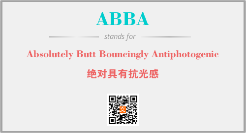 上述内容是“Absolutely Butt Bouncingly Antiphotogenic”作为“ABBA”的缩写,解释为“绝对具有抗光感”时的信息,以及英文缩略词ABBA所代表的英文单词,其对应的中文拼音、详细解释以及在英文中的流行度和相关分类、应用领域及应用示例等。