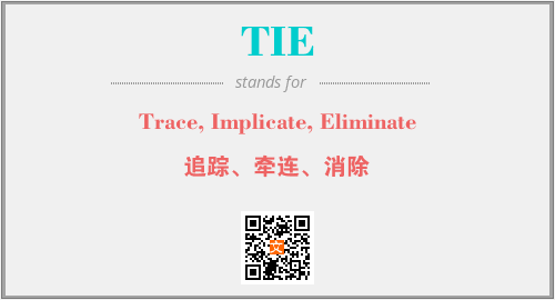 上述内容是“Trace, Implicate, Eliminate”作为“TIE”的缩写,解释为“追踪、牵连、消除”时的信息,以及英文缩略词TIE所代表的英文单词,其对应的中文拼音、详细解释以及在英文中的流行度和相关分类、应用领域及应用示例等。