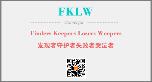上述内容是“Finders Keepers Losers Weepers”作为“FKLW”的缩写,解释为“发现者守护者失败者哭泣者”时的信息,以及英文缩略词FKLW所代表的英文单词,其对应的中文拼音、详细解释以及在英文中的流行度和相关分类、应用领域及应用示例等。