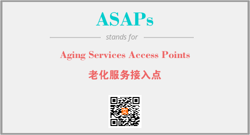 英文缩略词“ASAPs”经常作为“Aging Services Access Points”的英文缩写来使用,中文表示:“老化服务接入点”。本文将详细介绍英文缩写词ASAPs所代表英文单词,其对应的中文拼音、详细解释以及在英语中的流行度。此外,还有关于缩略词ASAPs的分类、应用领域及相关应用示例等。
