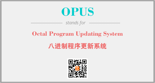 上述内容是“Octal Program Updating System”作为“OPUS”的缩写,解释为“八进制程序更新系统”时的信息,以及英文缩略词OPUS所代表的英文单词,其对应的中文拼音、详细解释以及在英文中的流行度和相关分类、应用领域及应用示例等。