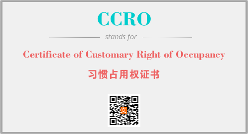 英文缩略词“CCRO”经常作为“Certificate of Customary Right of Occupancy”的英文缩写来使用,中文表示:“习惯占用权证书”。本文将详细介绍英文缩写词CCRO所代表英文单词,其对应的中文拼音、详细解释以及在英语中的流行度。此外,还有关于缩略词CCRO的分类、应用领域及相关应用示例等。