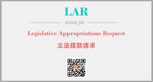 英文缩略词“LAR”经常作为“Legislative Appropriations Request”的英文缩写来使用,中文表示:“立法拨款请求”。本文将详细介绍英文缩写词LAR所代表英文单词,其对应的中文拼音、详细解释以及在英语中的流行度。此外,还有关于缩略词LAR的分类、应用领域及相关应用示例等。