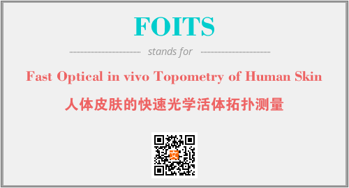 上述内容是“Fast Optical in vivo Topometry of Human Skin”作为“FOITS”的缩写,解释为“人体皮肤的快速光学活体拓扑测量”时的信息,以及英文缩略词FOITS所代表的英文单词,其对应的中文拼音、详细解释以及在英文中的流行度和相关分类、应用领域及应用示例等。