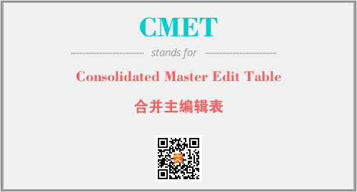 英文缩略词“CMET”经常作为“Consolidated Master Edit Table”的英文缩写来使用,中文表示:“合并主编辑表”。本文将详细介绍英文缩写词CMET所代表英文单词,其对应的中文拼音、详细解释以及在英语中的流行度。此外,还有关于缩略词CMET的分类、应用领域及相关应用示例等。