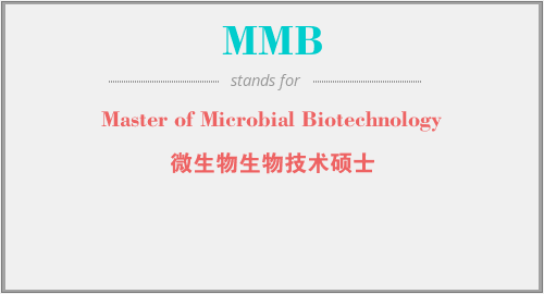上述内容是“Master of Microbial Biotechnology”作为“MMB”的缩写,解释为“微生物生物技术硕士”时的信息,以及英文缩略词MMB所代表的英文单词,其对应的中文拼音、详细解释以及在英文中的流行度和相关分类、应用领域及应用示例等。