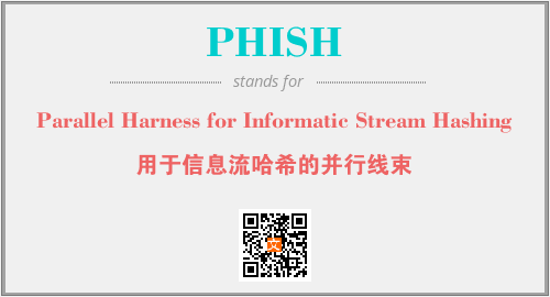 上述内容是“Parallel Harness for Informatic Stream Hashing”作为“PHISH”的缩写,解释为“用于信息流哈希的并行线束”时的信息,以及英文缩略词PHISH所代表的英文单词,其对应的中文拼音、详细解释以及在英文中的流行度和相关分类、应用领域及应用示例等。