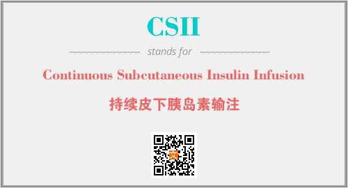 上述内容是“Continuous Subcutaneous Insulin Infusion”作为“CSII”的缩写,解释为“持续皮下胰岛素输注”时的信息,以及英文缩略词CSII所代表的英文单词,其对应的中文拼音、详细解释以及在英文中的流行度和相关分类、应用领域及应用示例等。