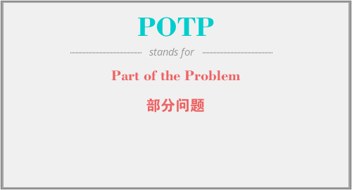上述内容是“Part of the Problem”作为“POTP”的缩写,解释为“部分问题”时的信息,以及英文缩略词POTP所代表的英文单词,其对应的中文拼音、详细解释以及在英文中的流行度和相关分类、应用领域及应用示例等。