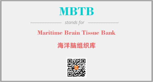 上述内容是“Maritime Brain Tissue Bank”作为“MBTB”的缩写,解释为“海洋脑组织库”时的信息,以及英文缩略词MBTB所代表的英文单词,其对应的中文拼音、详细解释以及在英文中的流行度和相关分类、应用领域及应用示例等。