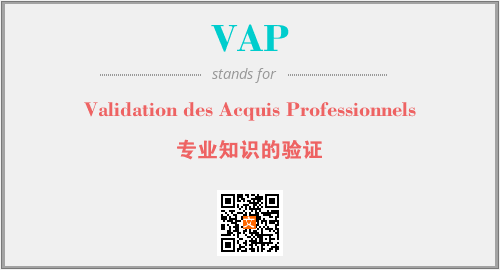 英文缩略词“VAP”经常作为“Validation des Acquis Professionnels”的英文缩写来使用,中文表示:“专业知识的验证”。本文将详细介绍英文缩写词VAP所代表英文单词,其对应的中文拼音、详细解释以及在英语中的流行度。此外,还有关于缩略词VAP的分类、应用领域及相关应用示例等。