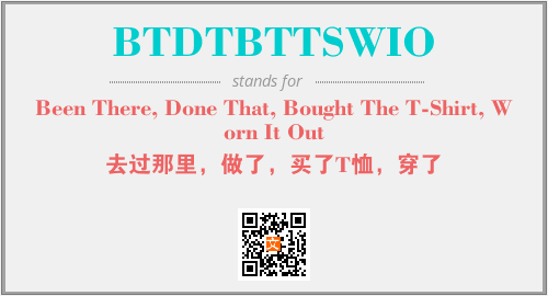 以上为Been There, Done That, Bought The T-Shirt, Worn It Out英文缩略词BTDTBTTSWIO的中文解释,以及该英文缩写在英语的流行度、分类和应用领域方面的信息。