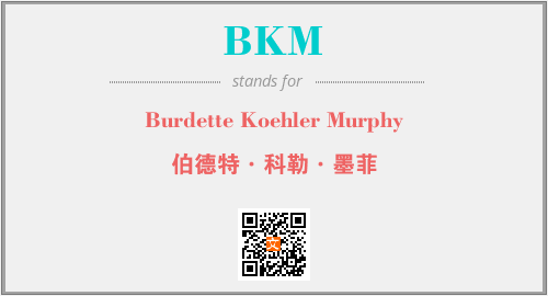 上述内容是“Burdette Koehler Murphy”作为“BKM”的缩写,解释为“伯德特·科勒·墨菲”时的信息,以及英文缩略词BKM所代表的英文单词,其对应的中文拼音、详细解释以及在英文中的流行度和相关分类、应用领域及应用示例等。