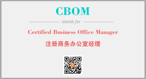 英文缩略词“CBOM”经常作为“Certified Business Office Manager”的英文缩写来使用,中文表示:“注册商务办公室经理”。本文将详细介绍英文缩写词CBOM所代表英文单词,其对应的中文拼音、详细解释以及在英语中的流行度。此外,还有关于缩略词CBOM的分类、应用领域及相关应用示例等。