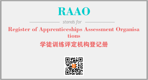 上述内容是“Register of Apprenticeships Assessment Organisations”作为“RAAO”的缩写,解释为“学徒训练评定机构登记册”时的信息,以及英文缩略词RAAO所代表的英文单词,其对应的中文拼音、详细解释以及在英文中的流行度和相关分类、应用领域及应用示例等。