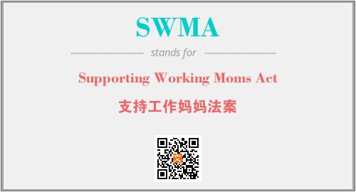 上述内容是“Supporting Working Moms Act”作为“SWMA”的缩写,解释为“支持工作妈妈法案”时的信息,以及英文缩略词SWMA所代表的英文单词,其对应的中文拼音、详细解释以及在英文中的流行度和相关分类、应用领域及应用示例等。