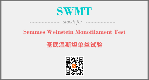 英文缩略词“SWMT”经常作为“Semmes Weinstein Monofilament Test”的英文缩写来使用,中文表示:“基底温斯坦单丝试验”。本文将详细介绍英文缩写词SWMT所代表英文单词,其对应的中文拼音、详细解释以及在英语中的流行度。此外,还有关于缩略词SWMT的分类、应用领域及相关应用示例等。