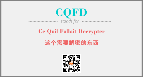 以上为Ce Quil Fallait Decrypter英文缩略词CQFD的中文解释,以及该英文缩写在英语的流行度、分类和应用领域方面的信息。