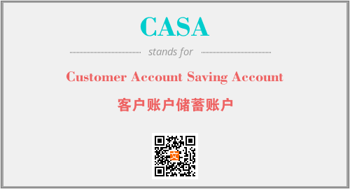 上述内容是“Customer Account Saving Account”作为“CASA”的缩写,解释为“客户账户储蓄账户”时的信息,以及英文缩略词CASA所代表的英文单词,其对应的中文拼音、详细解释以及在英文中的流行度和相关分类、应用领域及应用示例等。
