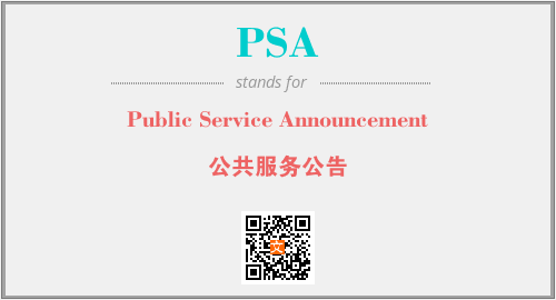 以上为Public Service Announcement英文缩略词PSA的中文解释,以及该英文缩写在英语的流行度、分类和应用领域方面的信息。