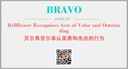 上述内容是“Bellflower Recognizes Acts of Valor and Outstanding”作为“BRAVO”的缩写,解释为“贝尔弗劳尔承认英勇和杰出的行为”时的信息,以及英文缩略词BRAVO所代表的英文单词,其对应的中文拼音、详细解释以及在英文中的流行度和相关分类、应用领域及应用示例等。