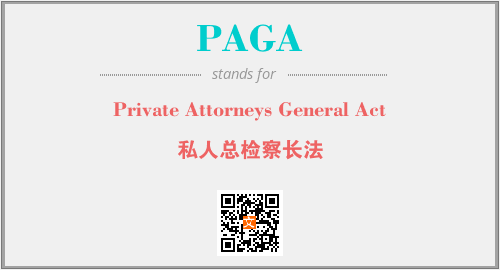 英文缩略词“PAGA”经常作为“Private Attorneys General Act”的英文缩写来使用,中文表示:“私人总检察长法”。本文将详细介绍英文缩写词PAGA所代表英文单词,其对应的中文拼音、详细解释以及在英语中的流行度。此外,还有关于缩略词PAGA的分类、应用领域及相关应用示例等。