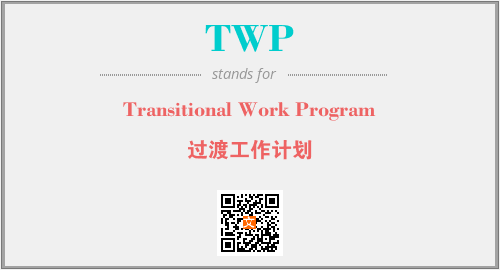 英文缩略词“TWP”经常作为“Transitional Work Program”的英文缩写来使用,中文表示:“过渡工作计划”。本文将详细介绍英文缩写词TWP所代表英文单词,其对应的中文拼音、详细解释以及在英语中的流行度。此外,还有关于缩略词TWP的分类、应用领域及相关应用示例等。