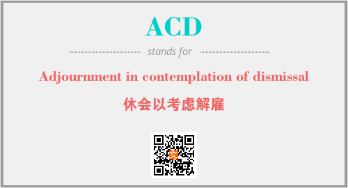 英文缩略词“ACD”经常作为“Adjournment in contemplation of dismissal”的英文缩写来使用,中文表示:“休会以考虑解雇”。本文将详细介绍英文缩写词ACD所代表英文单词,其对应的中文拼音、详细解释以及在英语中的流行度。此外,还有关于缩略词ACD的分类、应用领域及相关应用示例等。