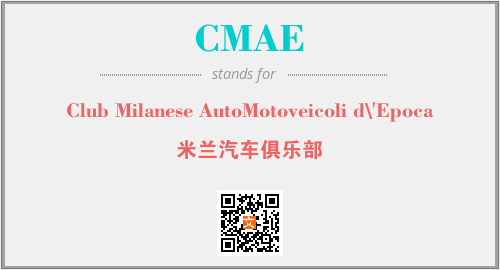 上述内容是“Club Milanese AutoMotoveicoli d\'Epoca”作为“CMAE”的缩写,解释为“米兰汽车俱乐部”时的信息,以及英文缩略词CMAE所代表的英文单词,其对应的中文拼音、详细解释以及在英文中的流行度和相关分类、应用领域及应用示例等。