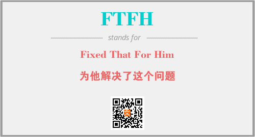 上述内容是“Fixed That For Him”作为“FTFH”的缩写,解释为“为他解决了这个问题”时的信息,以及英文缩略词FTFH所代表的英文单词,其对应的中文拼音、详细解释以及在英文中的流行度和相关分类、应用领域及应用示例等。