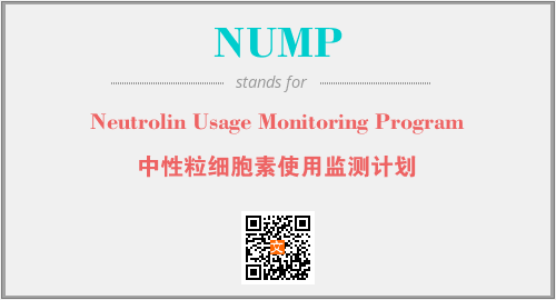 上述内容是“Neutrolin Usage Monitoring Program”作为“NUMP”的缩写,解释为“中性粒细胞素使用监测计划”时的信息,以及英文缩略词NUMP所代表的英文单词,其对应的中文拼音、详细解释以及在英文中的流行度和相关分类、应用领域及应用示例等。