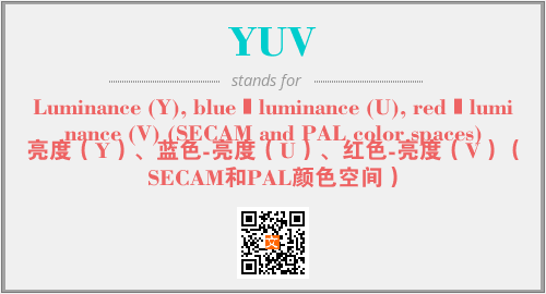 上述内容是“Luminance (Y), blue–luminance (U), red–luminance (V) (SECAM and PAL color spaces)”作为“YUV”的缩写,解释为“亮度(Y)、蓝色-亮度(U)、红色-亮度(V)(SECAM和PAL颜色空间)”时的信息,以及英文缩略词YUV所代表的英文单词,其对应的中文拼音、详细解释以及在英文中的流行度和相关分类、应用领域及应用示例等。