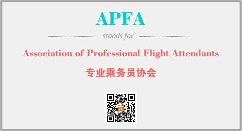 上述内容是“Association of Professional Flight Attendants”作为“APFA”的缩写,解释为“专业乘务员协会”时的信息,以及英文缩略词APFA所代表的英文单词,其对应的中文拼音、详细解释以及在英文中的流行度和相关分类、应用领域及应用示例等。