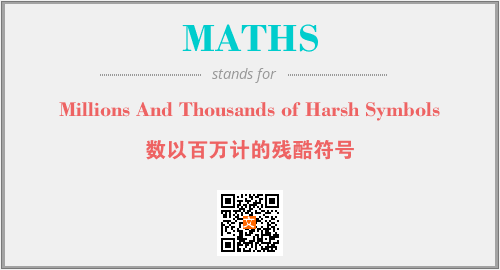 上述内容是“Millions And Thousands of Harsh Symbols”作为“MATHS”的缩写,解释为“数以百万计的残酷符号”时的信息,以及英文缩略词MATHS所代表的英文单词,其对应的中文拼音、详细解释以及在英文中的流行度和相关分类、应用领域及应用示例等。