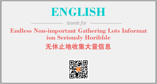 上述内容是“Endless Non-important Gathering Lots Information Seriously Horibble”作为“ENGLISH”的缩写,解释为“无休止地收集大量信息”时的信息,以及英文缩略词ENGLISH所代表的英文单词,其对应的中文拼音、详细解释以及在英文中的流行度和相关分类、应用领域及应用示例等。