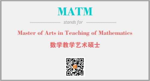 英文缩略词“MATM”经常作为“Master of Arts in Teaching of Mathematics”的英文缩写来使用,中文表示:“数学教学艺术硕士”。本文将详细介绍英文缩写词MATM所代表英文单词,其对应的中文拼音、详细解释以及在英语中的流行度。此外,还有关于缩略词MATM的分类、应用领域及相关应用示例等。