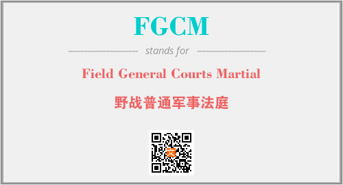 英文缩略词“FGCM”经常作为“Field General Courts Martial”的英文缩写来使用,中文表示:“野战普通军事法庭”。本文将详细介绍英文缩写词FGCM所代表英文单词,其对应的中文拼音、详细解释以及在英语中的流行度。此外,还有关于缩略词FGCM的分类、应用领域及相关应用示例等。