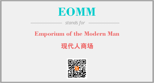 英文缩略词“EOMM”经常作为“Emporium of the Modern Man”的英文缩写来使用,中文表示:“现代人商场”。本文将详细介绍英文缩写词EOMM所代表英文单词,其对应的中文拼音、详细解释以及在英语中的流行度。此外,还有关于缩略词EOMM的分类、应用领域及相关应用示例等。