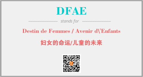 上述内容是“Destin de Femmes / Avenir d\'Enfants”作为“DFAE”的缩写,解释为“妇女的命运/儿童的未来”时的信息,以及英文缩略词DFAE所代表的英文单词,其对应的中文拼音、详细解释以及在英文中的流行度和相关分类、应用领域及应用示例等。