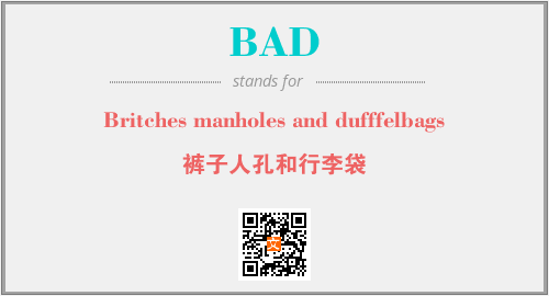 上述内容是“Britches manholes and dufffelbags”作为“BAD”的缩写,解释为“裤子人孔和行李袋”时的信息,以及英文缩略词BAD所代表的英文单词,其对应的中文拼音、详细解释以及在英文中的流行度和相关分类、应用领域及应用示例等。