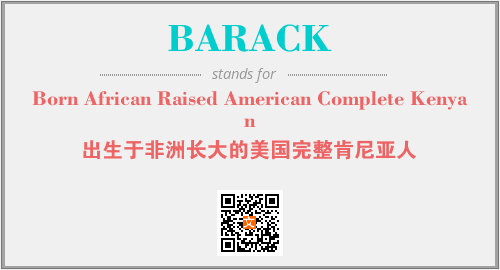 上述内容是“Born African Raised American Complete Kenyan”作为“BARACK”的缩写,解释为“出生于非洲长大的美国完整肯尼亚人”时的信息,以及英文缩略词BARACK所代表的英文单词,其对应的中文拼音、详细解释以及在英文中的流行度和相关分类、应用领域及应用示例等。