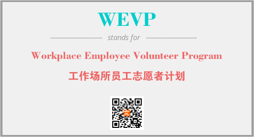 上述内容是“Workplace Employee Volunteer Program”作为“WEVP”的缩写,解释为“工作场所员工志愿者计划”时的信息,以及英文缩略词WEVP所代表的英文单词,其对应的中文拼音、详细解释以及在英文中的流行度和相关分类、应用领域及应用示例等。