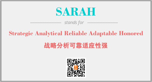 上述内容是“Strategic Analytical Reliable Adaptable Honored”作为“SARAH”的缩写,解释为“战略分析可靠适应性强”时的信息,以及英文缩略词SARAH所代表的英文单词,其对应的中文拼音、详细解释以及在英文中的流行度和相关分类、应用领域及应用示例等。