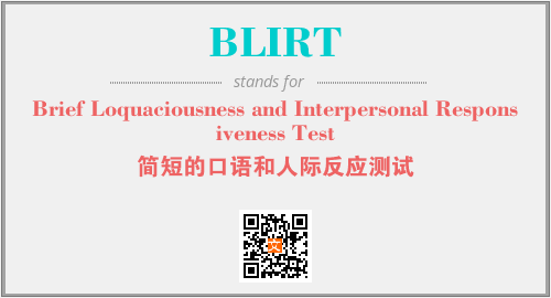 英文缩略词“BLIRT”经常作为“Brief Loquaciousness and Interpersonal Responsiveness Test”的英文缩写来使用,中文表示:“简短的口语和人际反应测试”。本文将详细介绍英文缩写词BLIRT所代表英文单词,其对应的中文拼音、详细解释以及在英语中的流行度。此外,还有关于缩略词BLIRT的分类、应用领域及相关应用示例等。