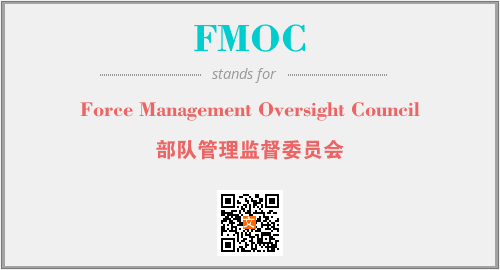 上述内容是“Force Management Oversight Council”作为“FMOC”的缩写,解释为“部队管理监督委员会”时的信息,以及英文缩略词FMOC所代表的英文单词,其对应的中文拼音、详细解释以及在英文中的流行度和相关分类、应用领域及应用示例等。