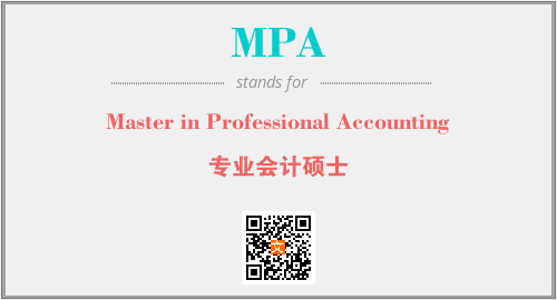 英文缩略词“MPA”经常作为“Master in Professional Accounting”的英文缩写来使用,中文表示:“专业会计硕士”。本文将详细介绍英文缩写词MPA所代表英文单词,其对应的中文拼音、详细解释以及在英语中的流行度。此外,还有关于缩略词MPA的分类、应用领域及相关应用示例等。
